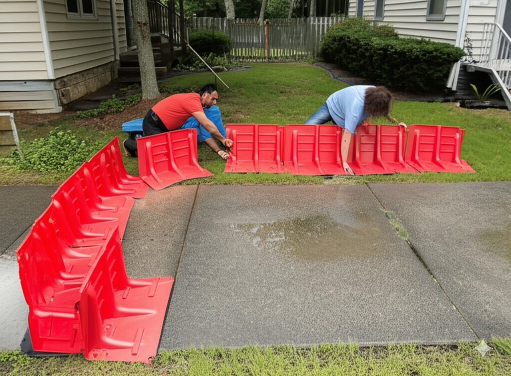 Flood barriers create a physical barrier to prevent water from entering a protected area, redirecting or containing floodwaters.