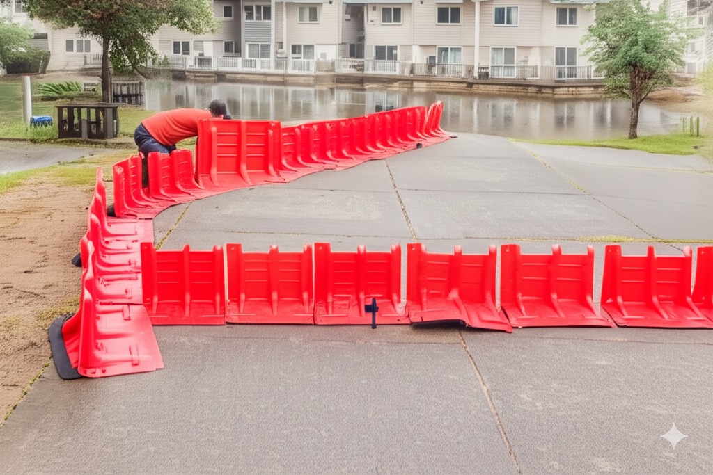 Flood barriers create a physical barrier to prevent water from entering a protected area, redirecting or containing floodwaters.